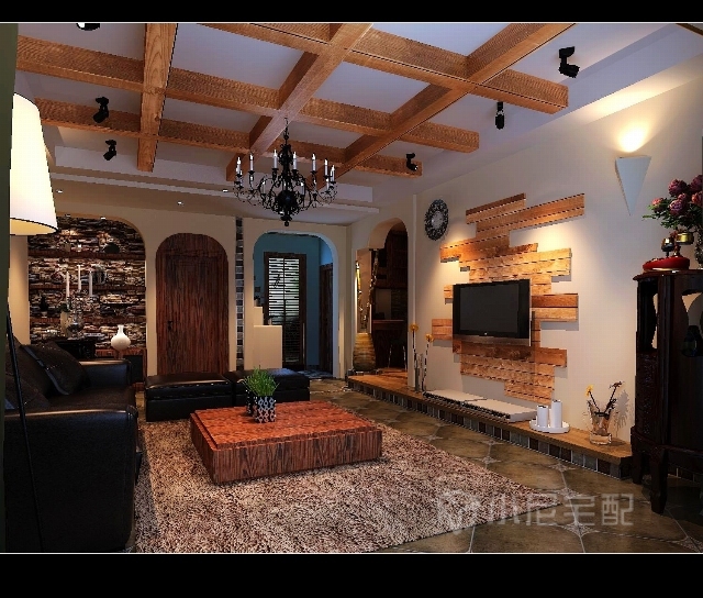 客廳頂部的設計與家具相互照應,完美結合