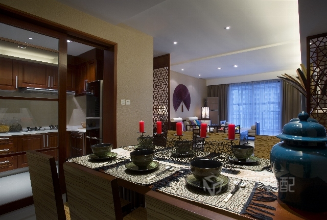 設計師充分運用了對比與融合的構成手法,將東南亞的色彩感覺和中式古典家具飾物結合起來,使得整個室內空間充滿了混搭的特殊質感和自然溫暖的情調。在空間的每個角落都融合了中式、東南亞情調及裝飾藝術的設計語言,既保存著現代古典的風雅氣韻和東南亞的浪漫風格,又在古典及優雅的空間中顯得格外有親和力。家裝家具一體價:22萬。