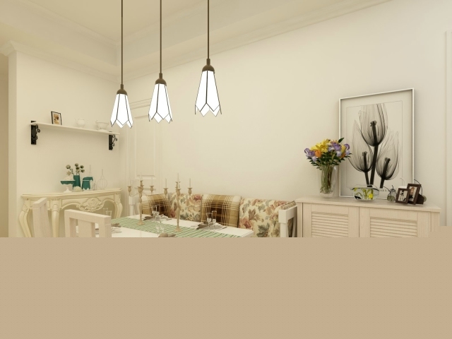 簡約的餐邊柜,可以放一些餐具,零食,增加儲物的功能,花瓣造型的長線吊燈為餐廳加以點綴。
