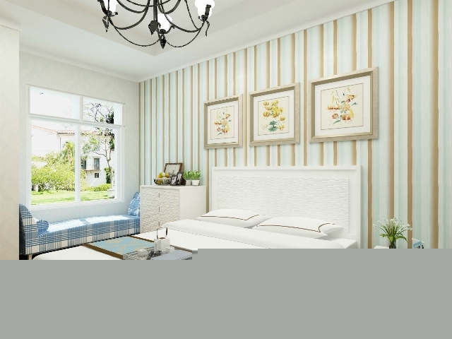 白色的波浪紋的床頭,黃色裝飾畫,淡綠色條紋壁紙,藍色格子的軟塌,搭配出最舒適的組合。