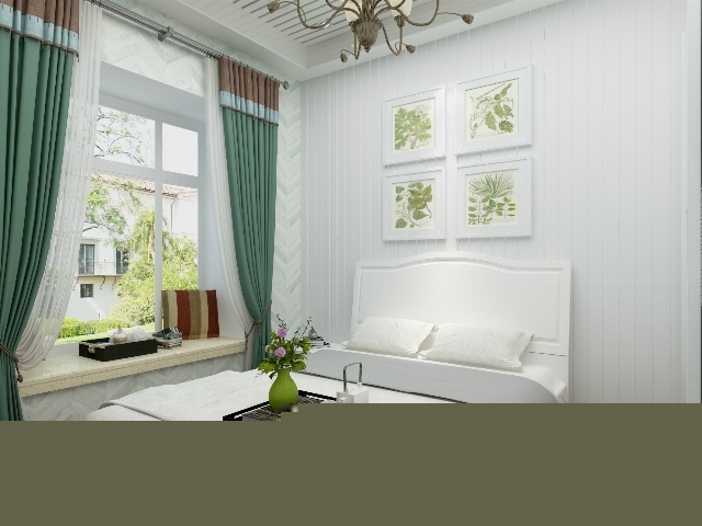 綠色的窗簾,白色的背景墻,綠植裝飾畫,營造自然清新的環境。