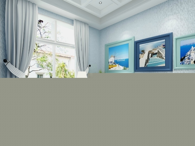 白色的書桌椅,藍色的沙發,大幅的希臘風景裝飾畫,既浪漫又有學習工作的靜謐的氛圍。