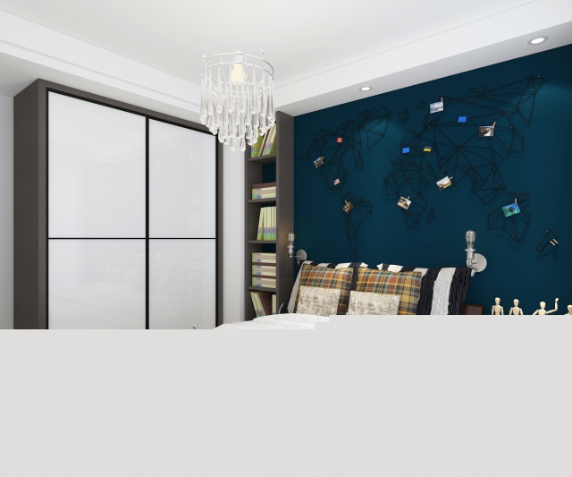 進入臥室,背景墻采用深色壁紙,搭配淺色吊頂,亮光烤漆白衣柜,運用顏色的對比,使空間更加清爽