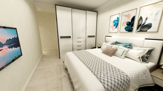 主臥,墻面貼暖色壁紙,采用白色家具調和空間整體色調