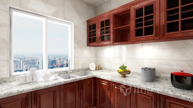廚房空間比較大 可以2至3人來準備可口的飯菜 玻璃的吊柜和開放格更容易拿到你想要的餐具或調料 整體凸顯出層次感