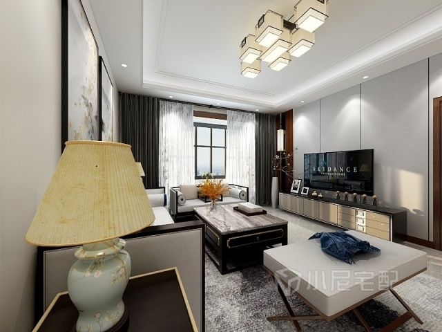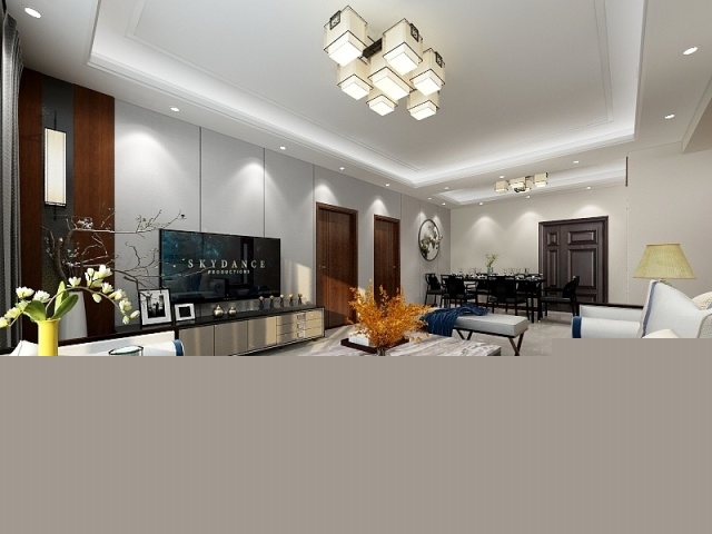 客廳電視背景墻與餐廳背景墻用硬包與黑色金屬條的銜接是使空間看的更加整體連貫。