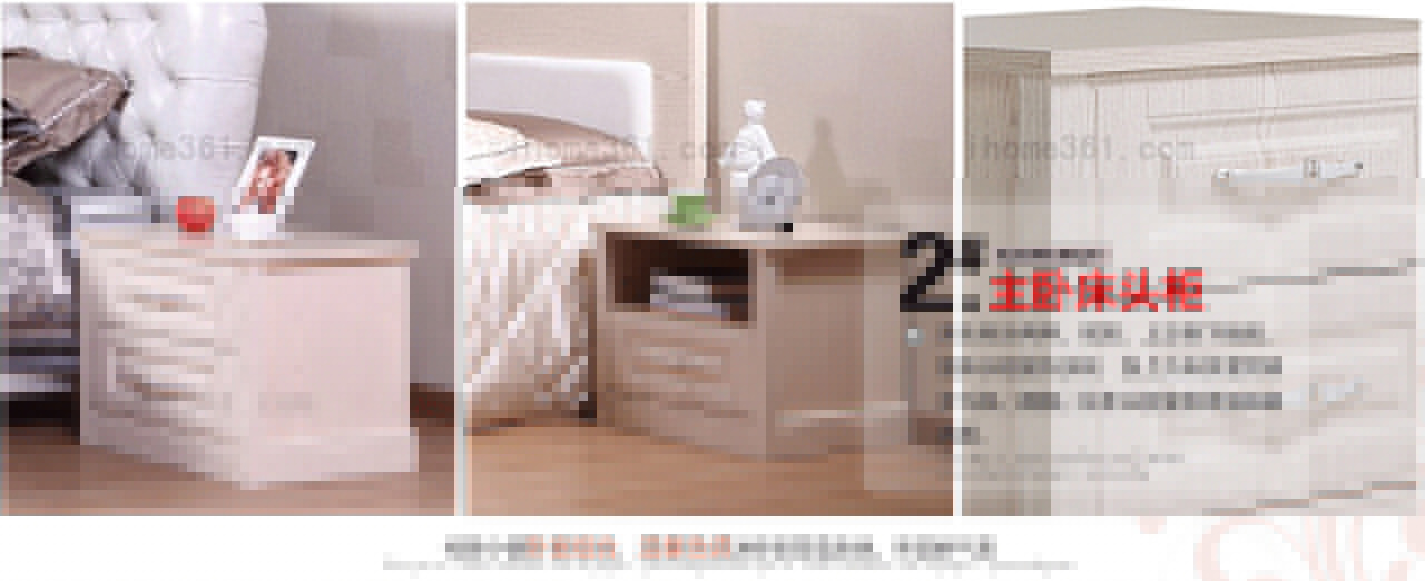 | 細(xì)節(jié)描述 | 床的床頭采用優(yōu)質(zhì)珍珠粉皮,質(zhì)感細(xì)膩,柔然舒服,環(huán)保不變形;床頭柜分兩種,雙屜、上空格下抽屜,使床頭柜儲(chǔ)存多樣;床尾柜體分區(qū)合理,配上古典懷舊的白橡紋理,更顯時(shí)尚感;妝臺(tái)精致淡雅,加上白橡紋理,賦有簡(jiǎn)約、古典的造型;妝凳以秀氣的形象與妝臺(tái)相搭配,使他們流露出不俗的氣質(zhì);衣柜則融合了西方的古典風(fēng)格和東方的現(xiàn)代神韻,儲(chǔ)存功能齊全、分區(qū)明確。 |